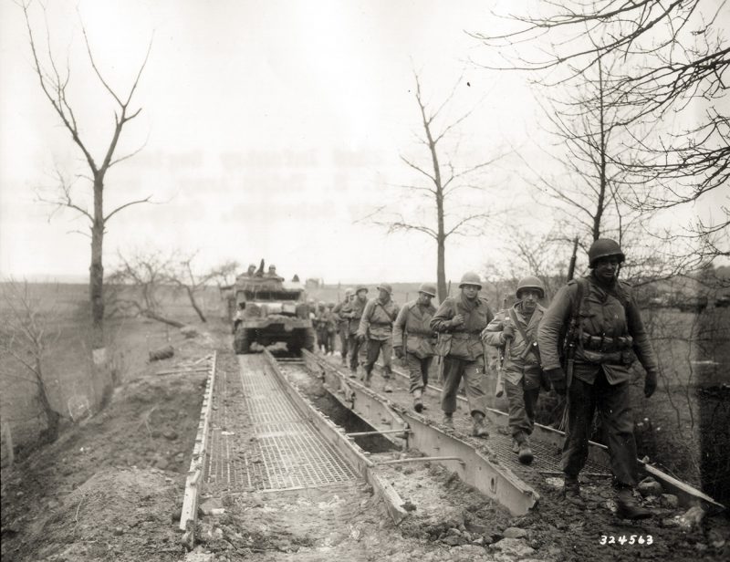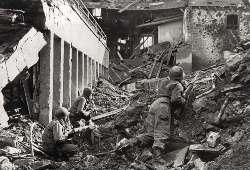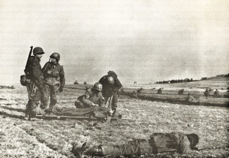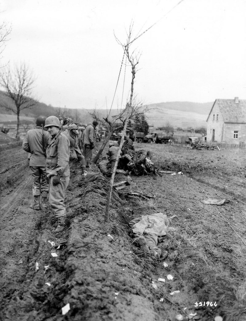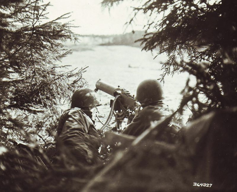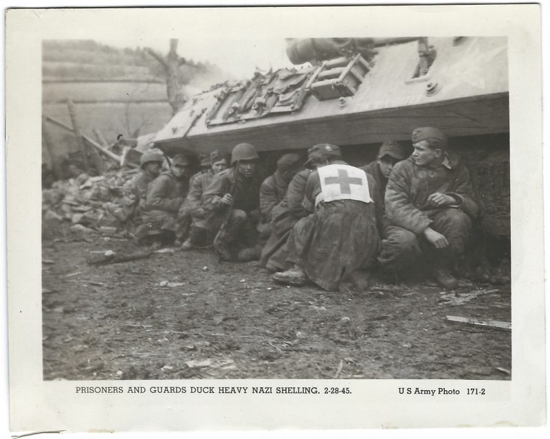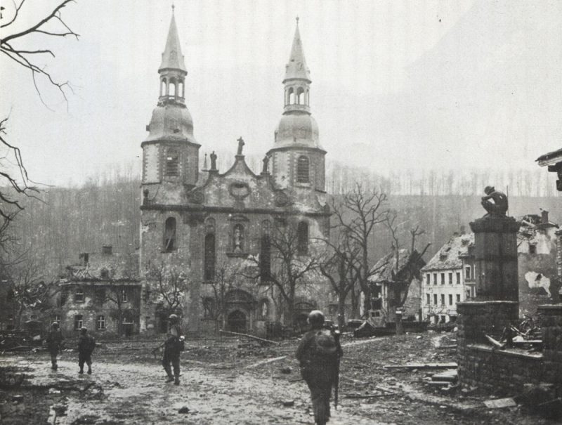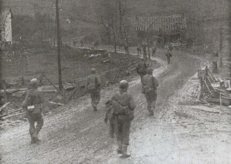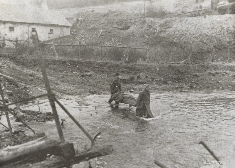 German prisoners carry a wounded GI over the Prüm river, Dausfelder Mühle